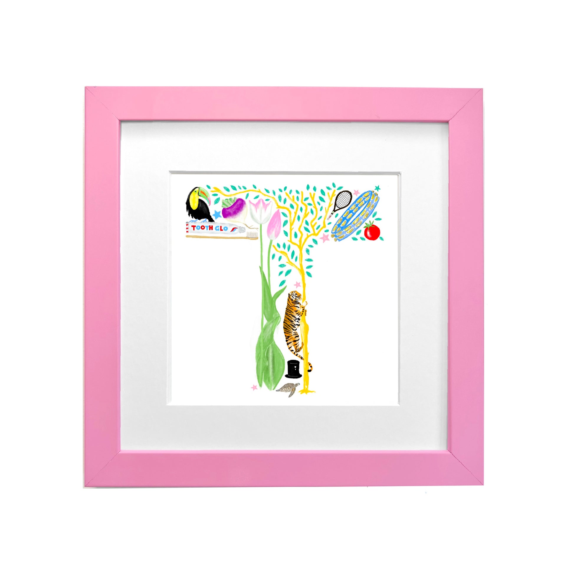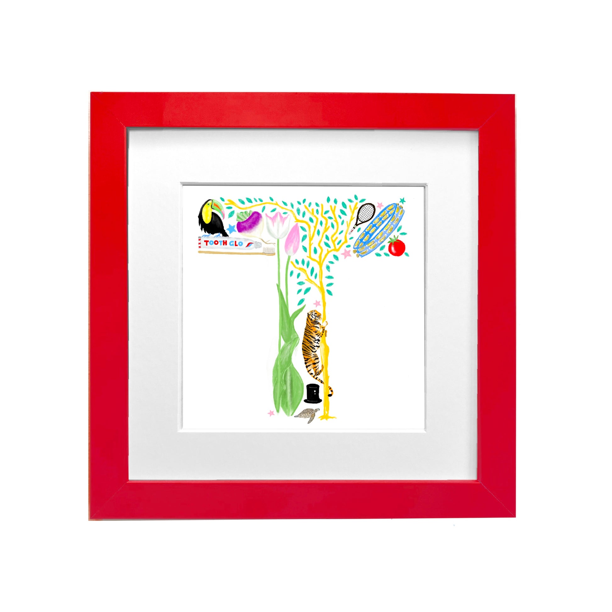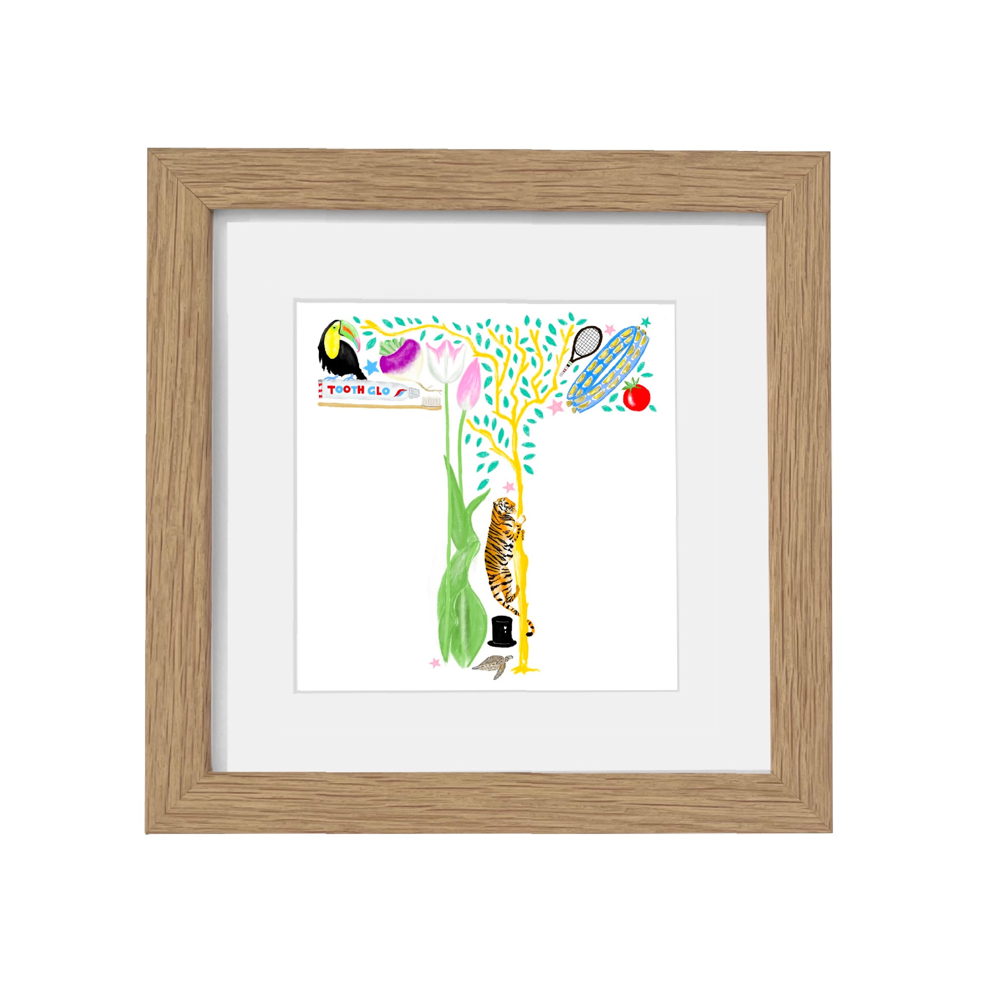 Our hand drawn letter T print made up of colourful things that begin with the letter T. This By Meloo illustration comes in a wooden red, pink, white, blue or oak frame and is ready to be hung in any room.