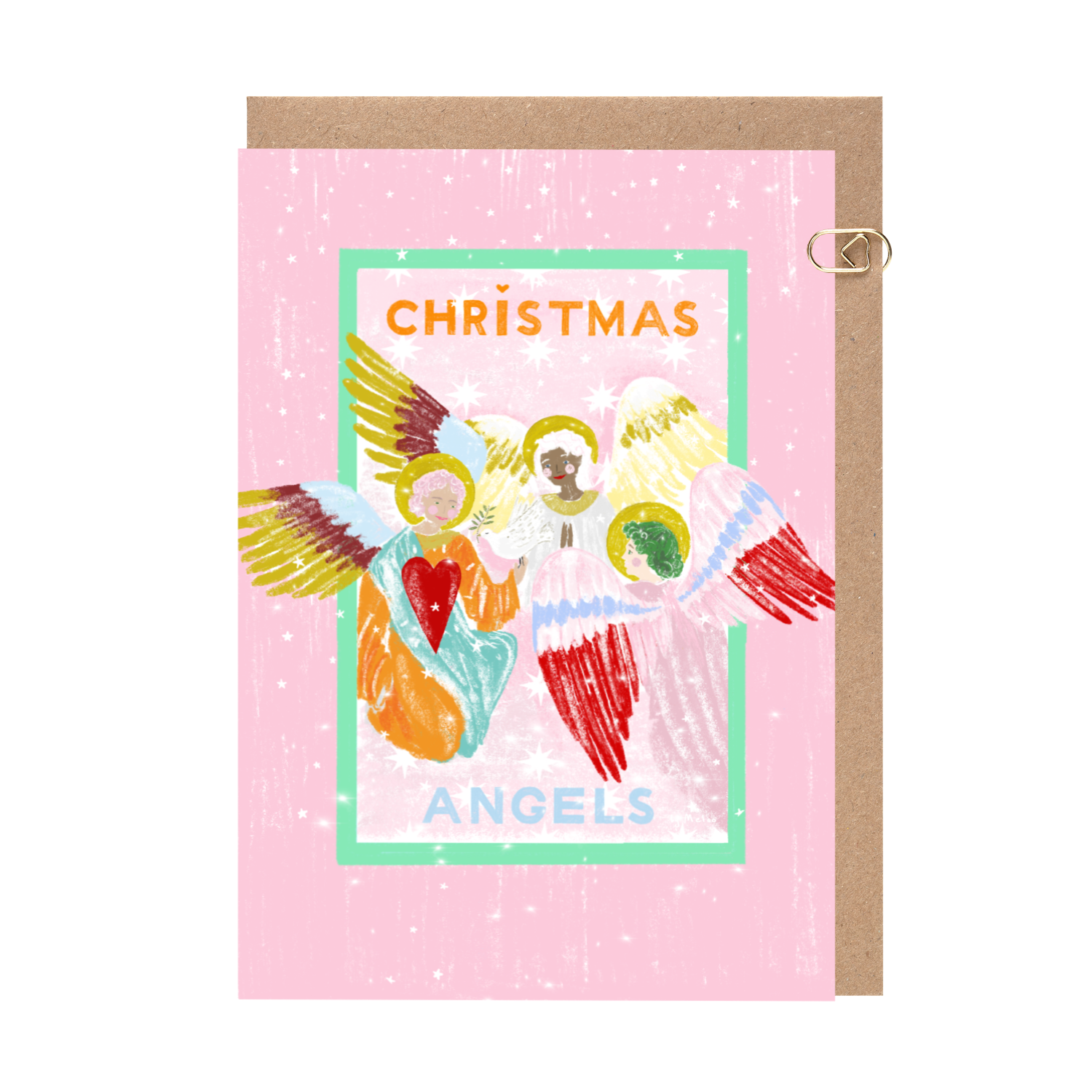 A colourful and playful ensemble of Christmas Angels. Bright wings in gold, red and blue. A well placed crimson heart and adorned with white stars throughout. Set in pastel pink with a bright aquamarine frame, the Christmas angels are a universal Christmas image brought to life in a signature colour palette. This illustration is hand-drawn by illustrator Melissa Greenwood.