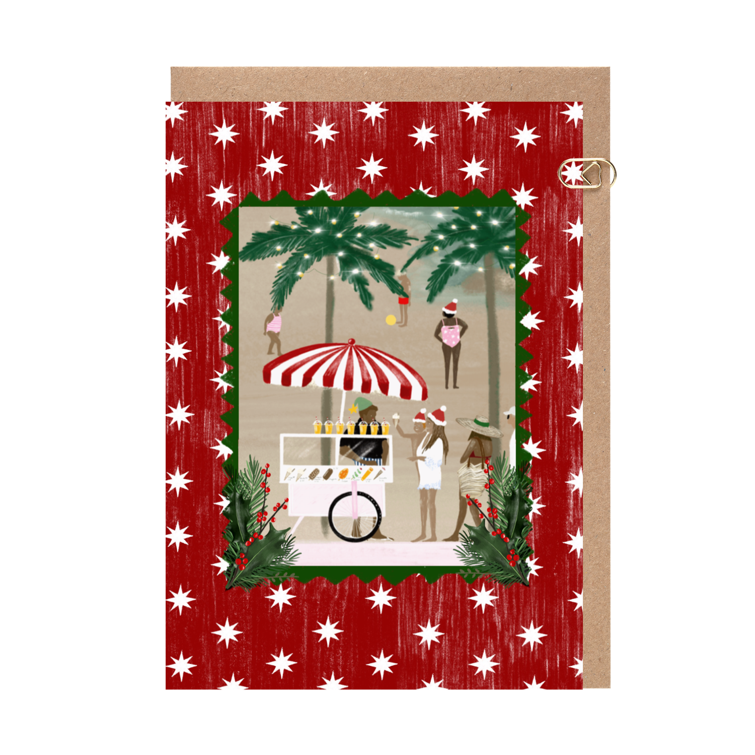 Some Christmas additions to my Celestial range. A Christmas beach scene with palm trees, Christmas hats, swimsuits and of course an ice cream vendor. Set in a red starred background with a green frame. This illustration is hand-drawn by illustrator Melissa Greenwood.