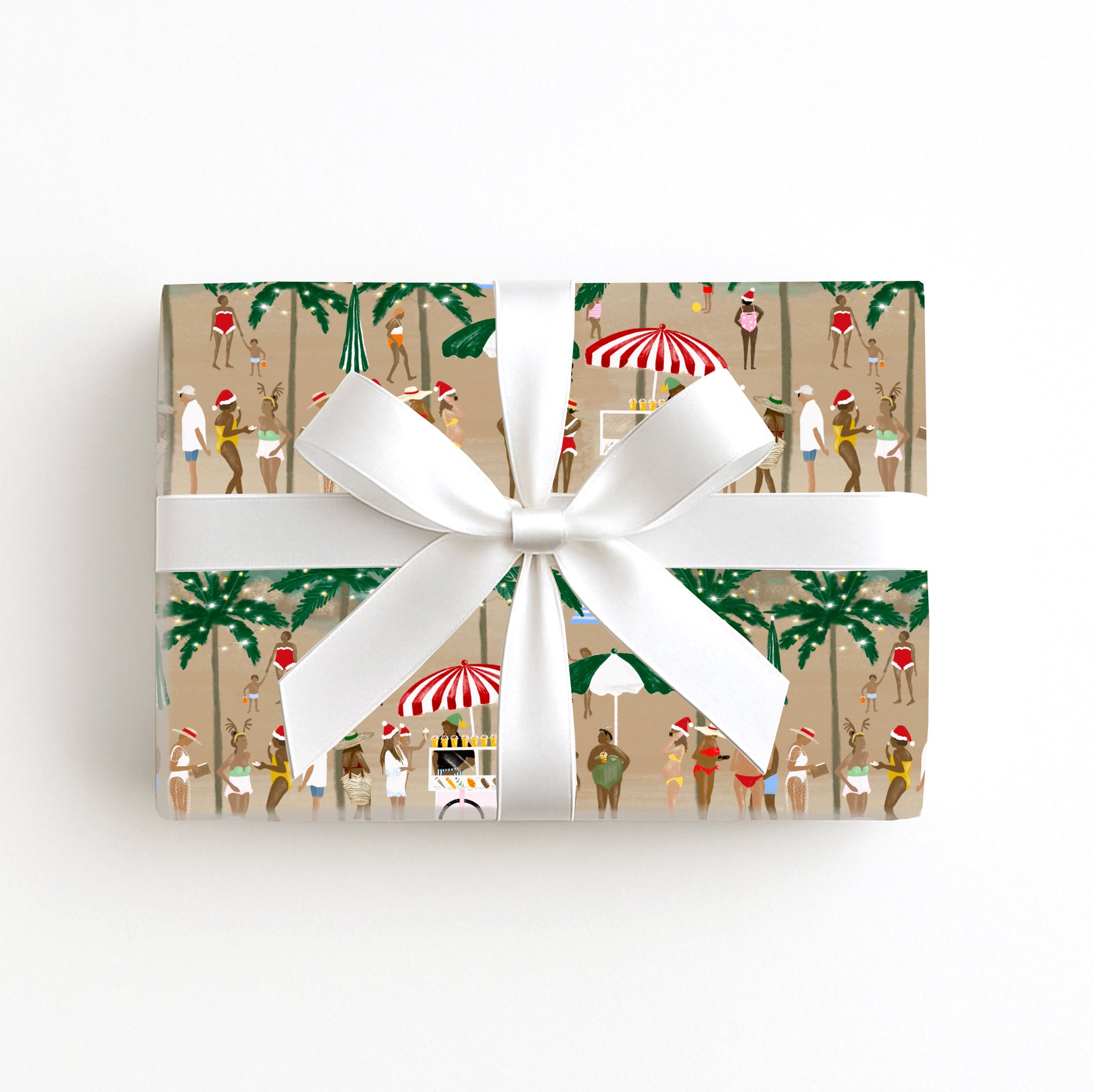 By Meloo illustrations, now available in matching wrapping paper for the festive season. The Christmas Beach wrap is a fun-filled party on the beach with caharacters enjoying drinks under palm trees. This illustration is hand-drawn by illustrator Melissa Greenwood.