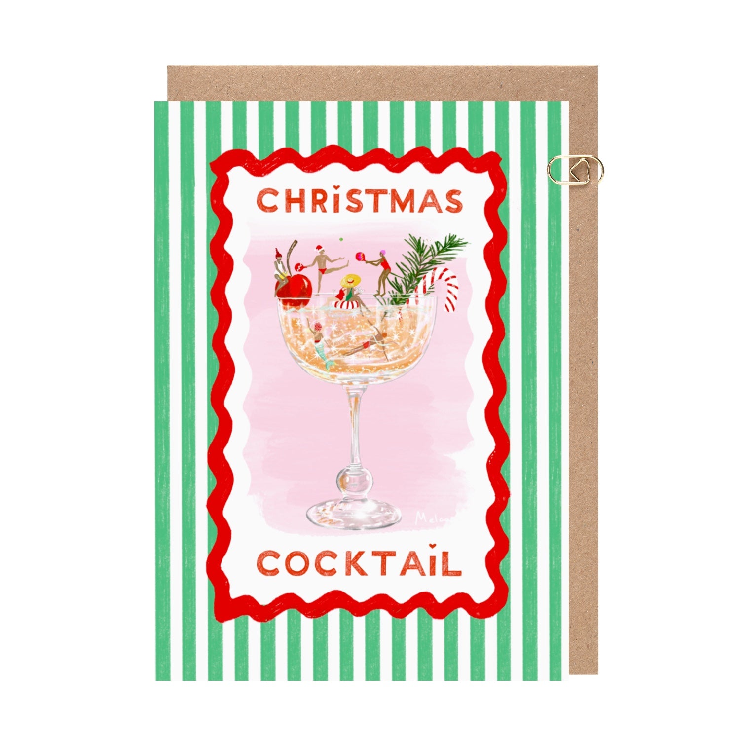 Inspired by 'Christmas drinks', the festive cocktail is garnished with festive trinkets and swimming characters. Bordered with a fun red scallop edge. This illustration is hand-drawn by illustrator Melissa Greenwood.