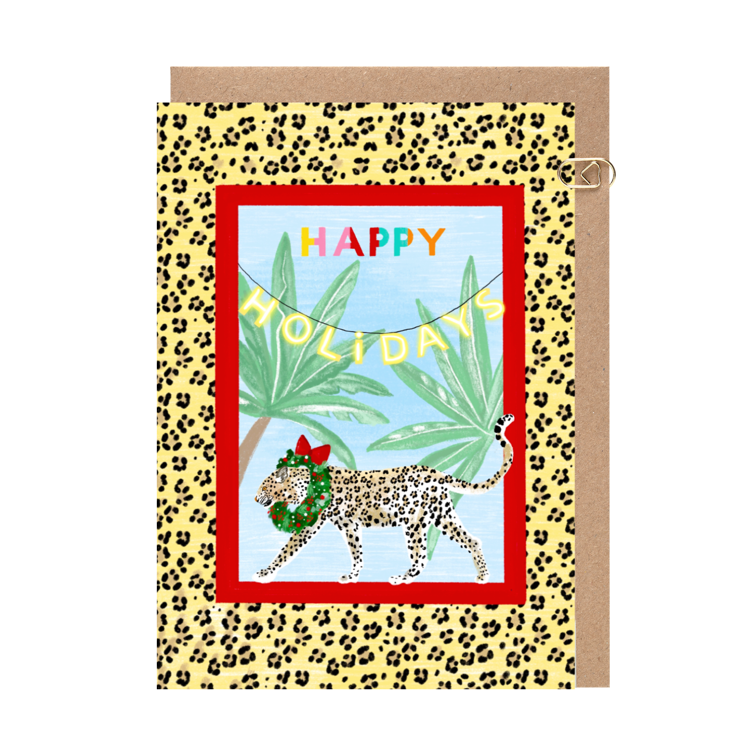 Inspired by the wild prints of a cheetah and the indulgence of Christmas. A cheetah print background with tropical themes and a red border. Amusing and for those wild friends and family members or the extrovert child. This illustration is hand-drawn by illustrator Melissa Greenwood.