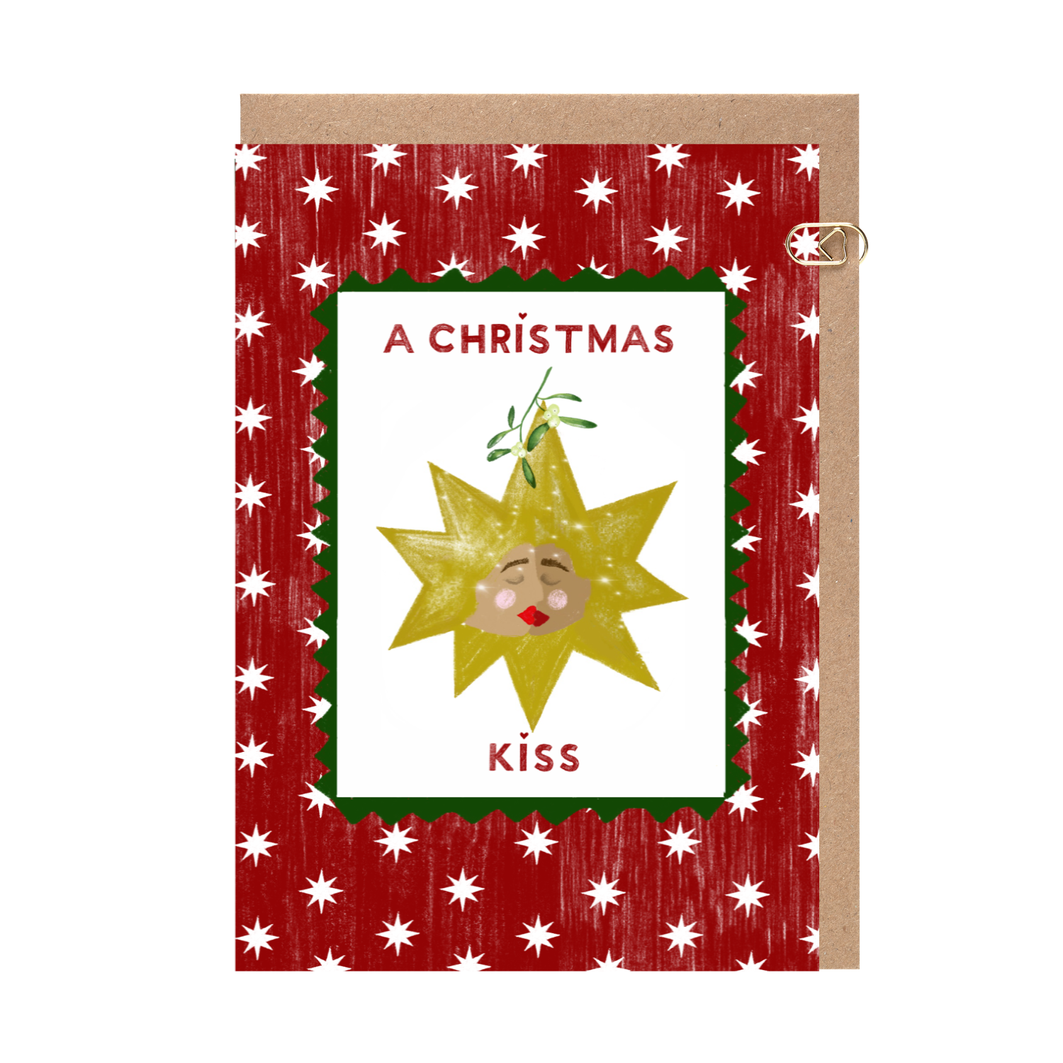 Some Christmas additions to my Celestial range. Mistletoe above the star character with a Christmas red background, green frame and stars. This illustration is hand-drawn by illustrator Melissa Greenwood.