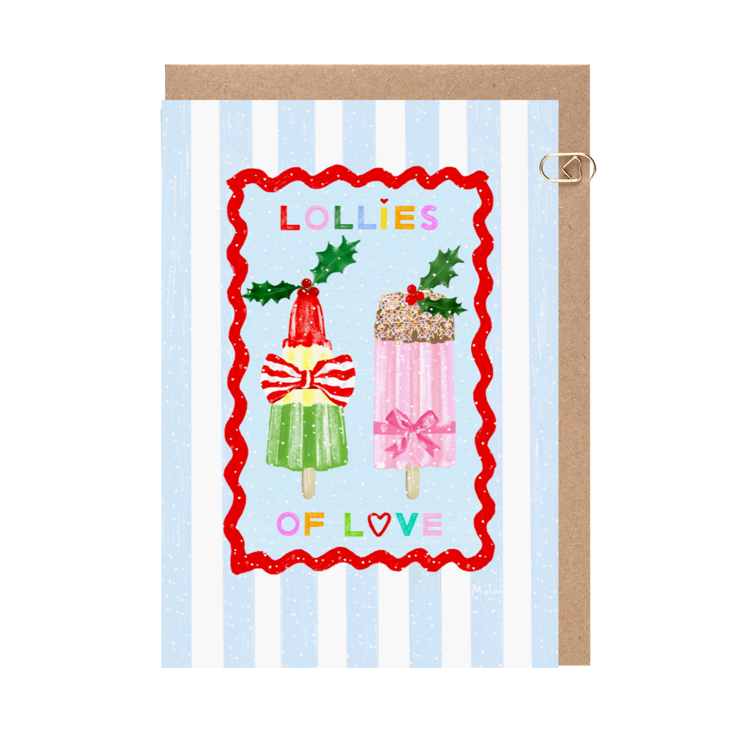 Colourful ice lollies with Christmas bows, holly adornments and multicoloured letters. A lively and vibrant card with a pastel blue and white candy stripe background and a red ribbon, scallop frame. This illustration is hand-drawn by illustrator Melissa Greenwood.