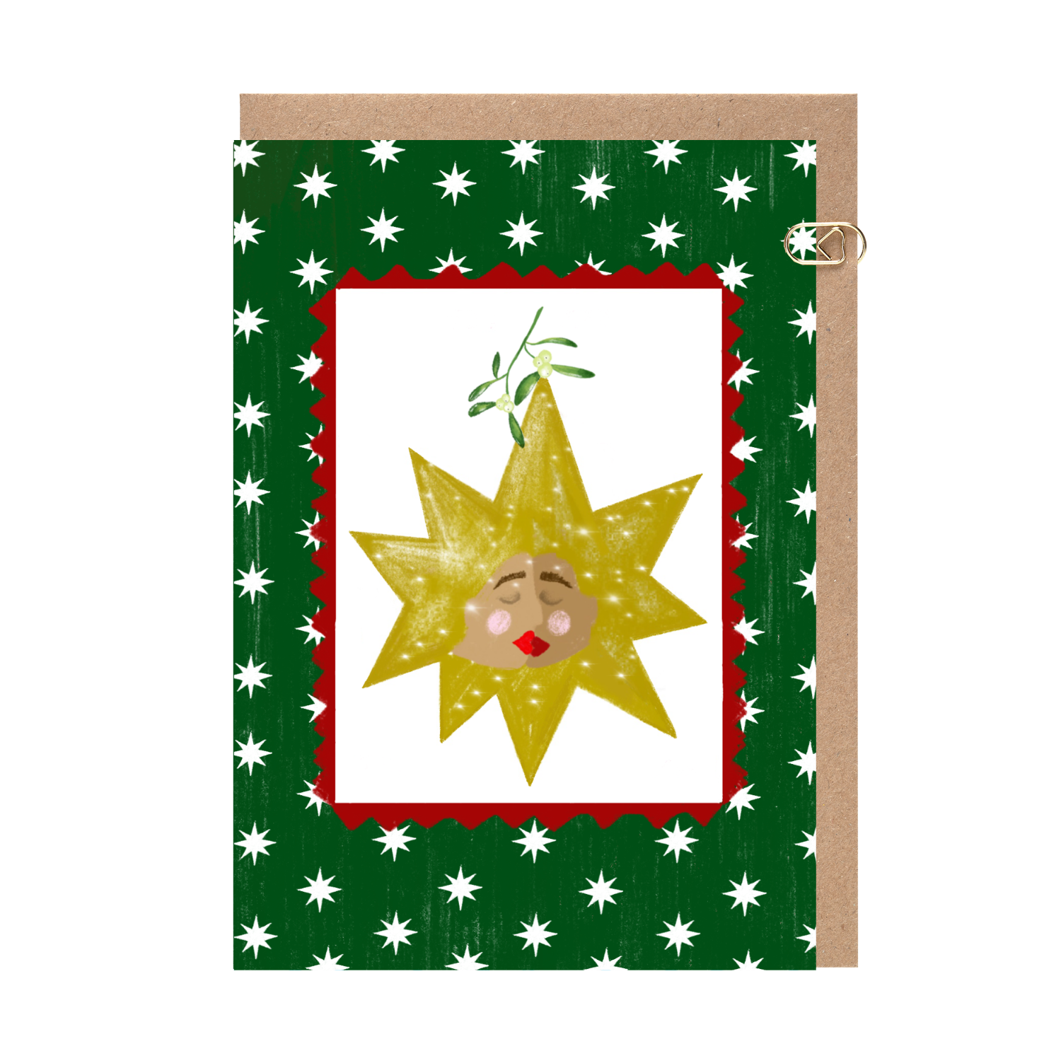 Some Christmas additions to my Celestial range. Mistletoe above the star character with a Christmas green background, red frame and stars. This illustration is hand-drawn by illustrator Melissa Greenwood.