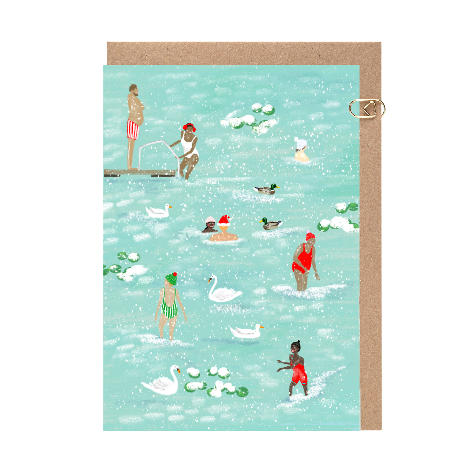 Beautiful eco-friendly, luxury-quality characterful A6 Christmas Wild Swim card and envelope, made in the UK.