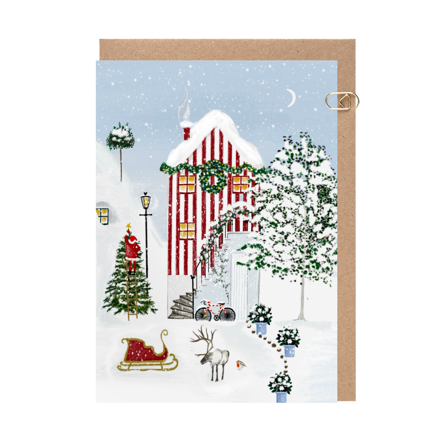 A Christmas scene imagined By Meloo. An red and white striped house decorated in lights and wreaths for Christmas. Father Christmas putting the last decoration atop the tree. Reindeer, a sleigh, a Christmas bike and more. This illustration is hand-drawn by illustrator Melissa Greenwood.