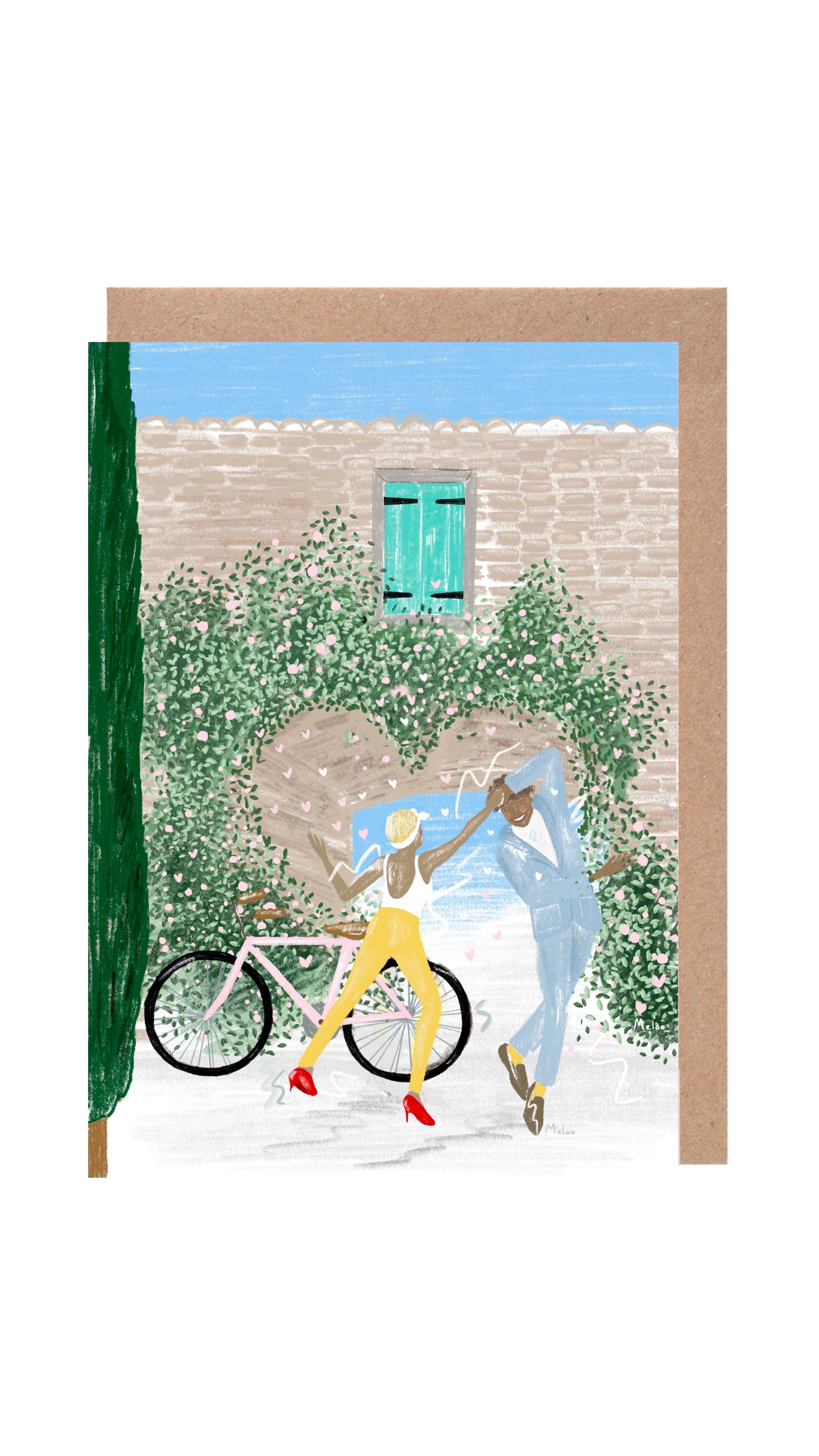 This blue and yellow dance illustration with bicycle and hearts in the flowers (if you look carefully) is hand-drawn by illustrator Melissa Greenwood and is part of a Collaboration Collection published by The Art File